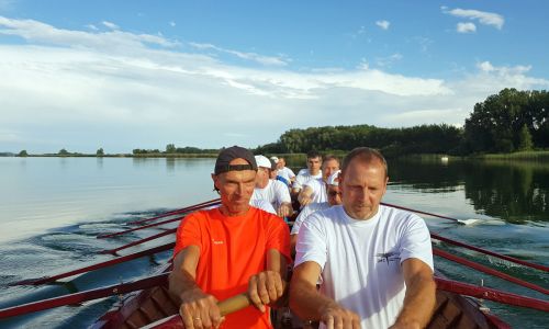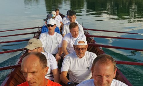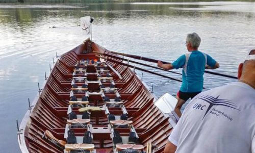 Wir sind schnell – sicher so schnell wie eines unserer Gigboote. Das liegt zum einen daran, dass Lars und Dirk einen beeindruckenden Doppelschlag hinlegen, zum anderen, dass die Mannschaft bei einem Kirchboot 14 Ruderplätze besetzt und die knapp eine halbe Tonne Bootsgewicht fast spielend beschleunigt.
