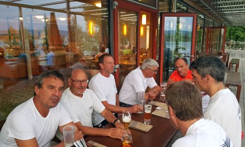 Im Naturfreundehaus Markelfingen ist der fröhliche Ausklang geplant. Anders als bei den Mondscheinfahrten, bei denen Wasserschuhe und Bootslagerung abendfüllende Themen sind, rudern wir mit Schwung ans Gestade, vertäuen das Schiff an einer eigens dafür gepflanzten Buche und kommen trockenen Fußes in die Wirtschaft. Rolf Hospach erweist sich nicht nur in Sachen Bootsleihe als sehr spendabel und lädt die gesamte hungrige und durstige Mannschaft zu einem Imbiss ein. Zurück kommen wir gerade noch vor einem der sommerlichen Regengüsse. Ein ganz herzliches Dankeschön an Rolf Hospach und die RG SeeMalRhein!