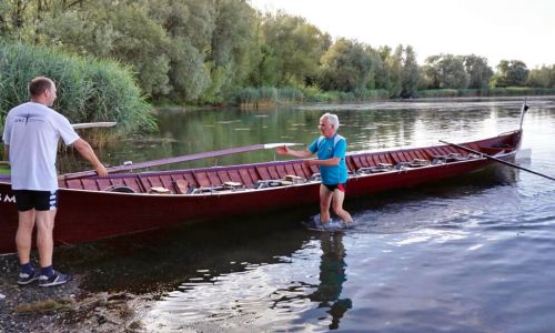 Wir rudern aus dem Markelfinger Winkel um die Mettnau ein Stück Richtung Radolfzell, dann bis zur Spitze der Reichenau und zurück über das Naturfreundehaus Markelfingen. Alle sind begeistert: Wir haben jeweils einen Nebensitzer, die Einsamkeit auf dem Bootsplatz ist Geschichte. Richtung Bug verliert man angesichts der Zahl der Plätze etwas den Überblick. Alle Positionen sind begehbar (markiert durch Fußabdrücke auf dem Holz in Yeti-Format) und neben dem Sitz sind Bohrungen, die mit Getränken bestückt werden können. Das Auf- und Abdrehen der Riemen entfällt, was am Anfang den einen oder anderen Krebs verursacht.
