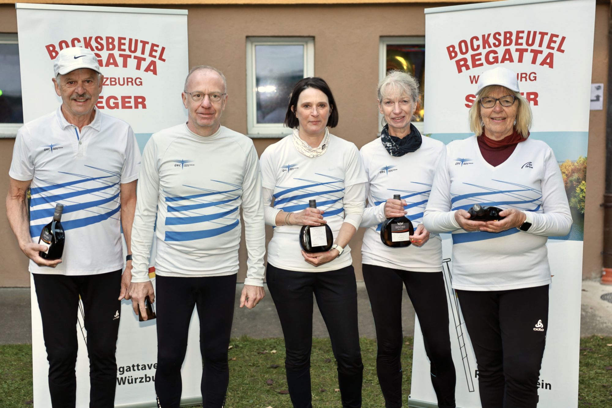 Bei etwas frischem, aber ansonsten schönstem Herbstwetter konnten wir den Tag in Würzburg verbringen und unsere beiden Rennen absolvieren. Der Vierer mit Verena, Hubert, Sabine, Peter und Ulrike am Steuer startete gegen 11 Uhr in der Klasse „Masters-Mixed Doppelvierer m. St. Gig G“. Einen direkten Gegner gab es nicht, dafür galt es die Zeitvorgabe von 19:18 Minuten aus den Vorjahren zu unterbieten. Lautstark angefeuert von den Teilnehmern des Überlinger Achters erreichte der Vierer nach 19:14 min das Ziel und erkämpfte sich damit den ersten Platz in seiner Klasse !