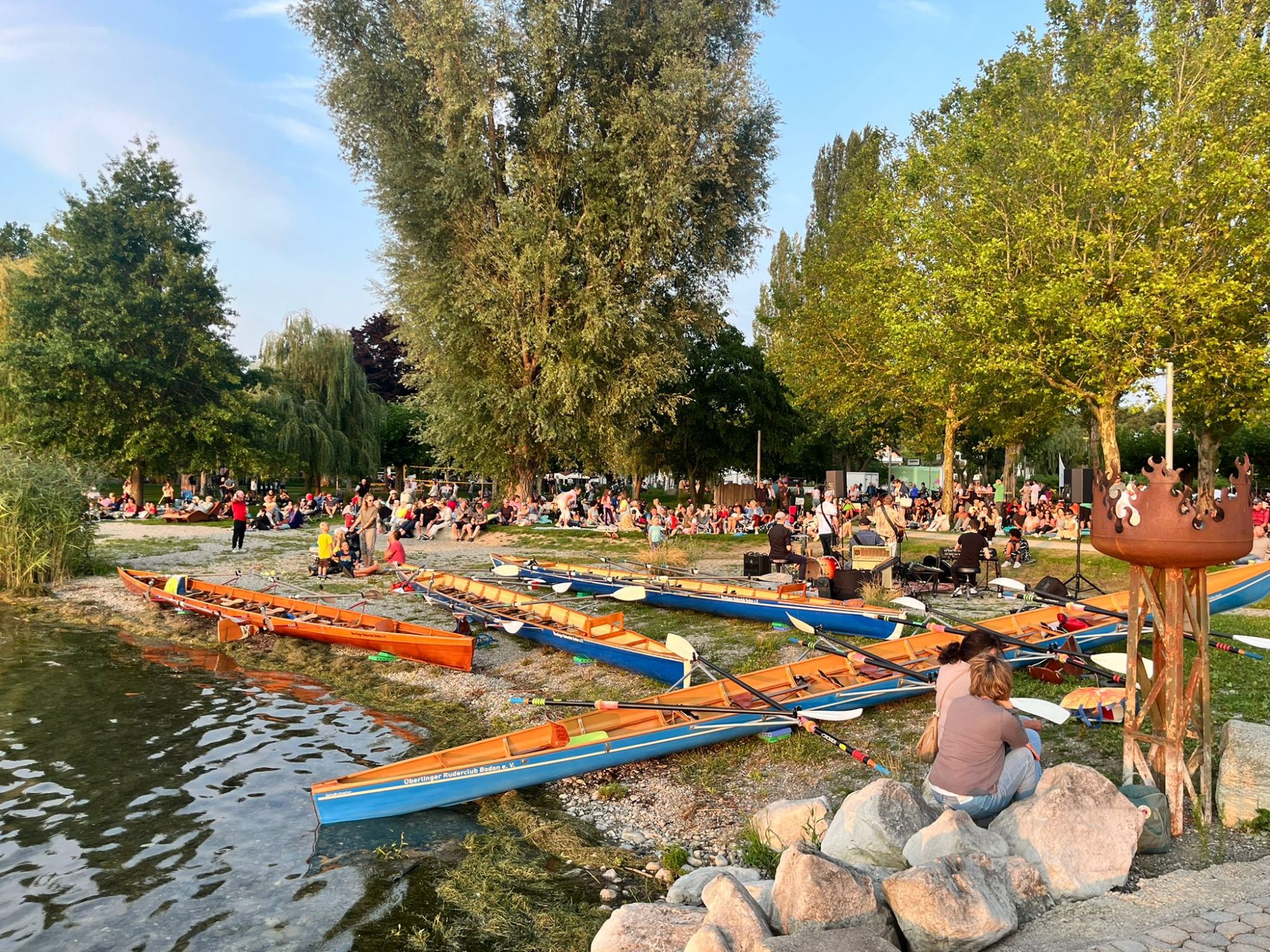 Der Abend war schlichtweg zauberhaft: In gemütlicher Runde genossen wir das Konzert und den goldorangen Sonnenuntergang. Bald danach brachen wir auf und erlebten den Mondaufgang über den Pappeln von Unteruhldingen. Das goldene Mondlicht lag über dem tiefblauen See und begleitete uns auf unserem Heimweg – ein Genuss für Augen und Seele.