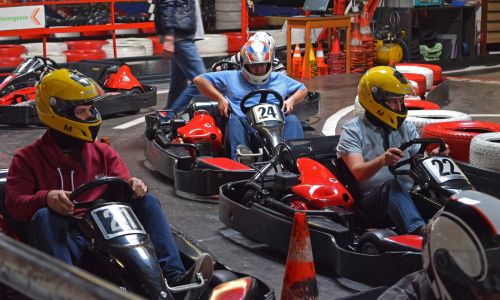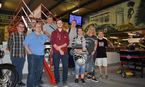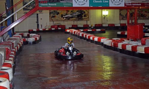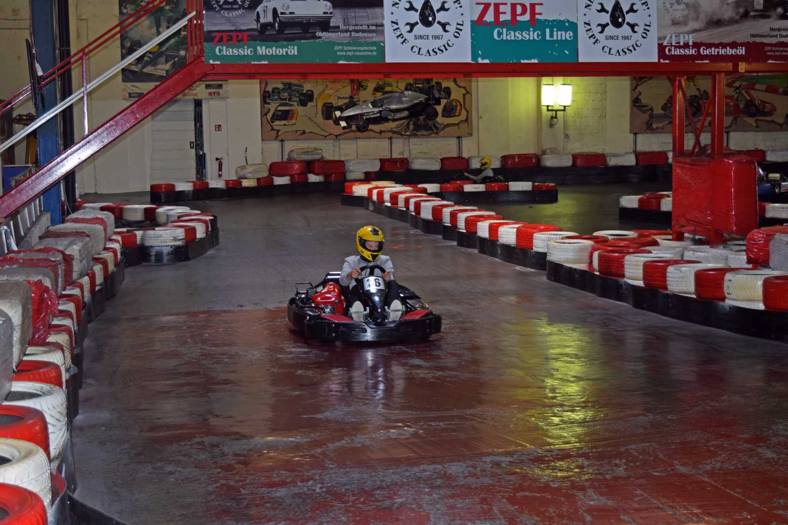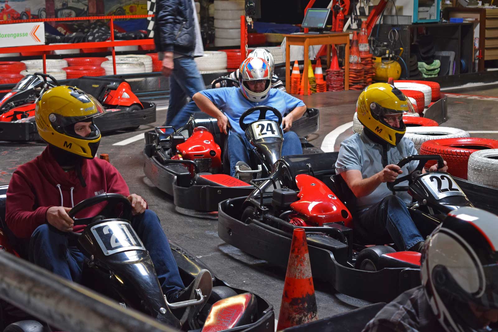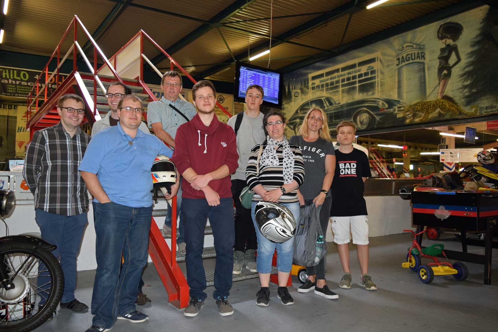 Auf dem ca. 550 Meter langen Indoor-Parcours durften wir unsere Runden drehen. Geschwindigkeiten bis zu 50 km/h wurden erreicht und die Rundenzeiten sogar elektronisch ausgewertet. So erhielten wir hinterher unsere Statistik, um zu sehen, wer der begabteste Rennfahrer war (Diese Insider-Informationen werden jedoch nicht herausgegeben…) Unfallfrei und mit von der schwergängigen Lenkung schwer gewordenen Händen durften wir dann nach knapp 30 Minuten wieder in die Boxengasse zurückkehren und unsere „Indy-Carts“ verlassen. Jetzt war noch unser jüngster Mitfahrer an der Reihe, der begleitet von einem echten Kart-Profi im Doppelsitzer-Kart noch einige Runden drehen durfte. Der Spaßfaktor war für uns alle eindeutig sehr groß!