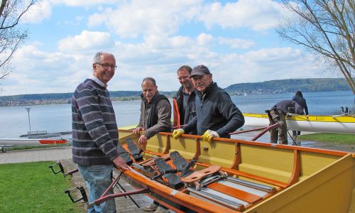 Bei den Breitensportbooten arbeiteten Männer und Jungs fachmännisch zusammen. Eine Grundreinigung und Überprüfung tat allen Booten gut, schließlich soll die Generalüberholung möglichst bis zum Herbstputz über viele tausend Ruderkilometer anhalten.