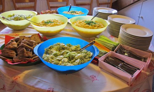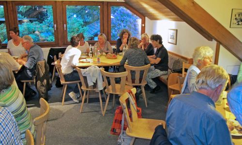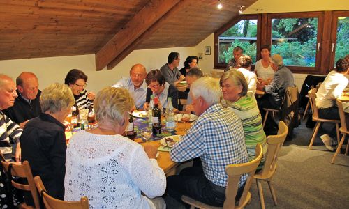 Aufgrund der fast sommerlichen Nachmittagstemperaturen hofften wir, den Abend draußen verbringen zu können. Doch leider vertrieben uns plötzliche Sturmböen und ein kurzer Schauer in den Aufenthaltsraum. Hier zu essen, erschien uns doch sicherer. Das zarte Wildfleisch ließen sich alle genussvoll auf der Zunge zergehen und lobten den Koch. Jeder konnte zugreifen, so oft er wollte, denn alles war reichlich vorhanden.