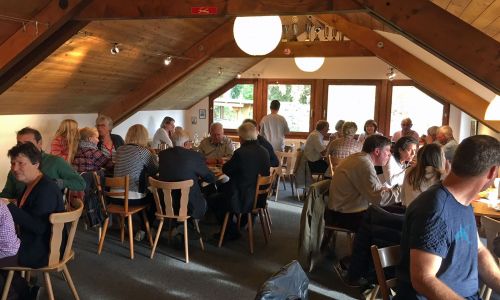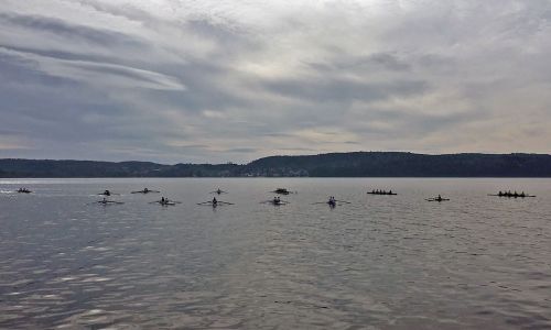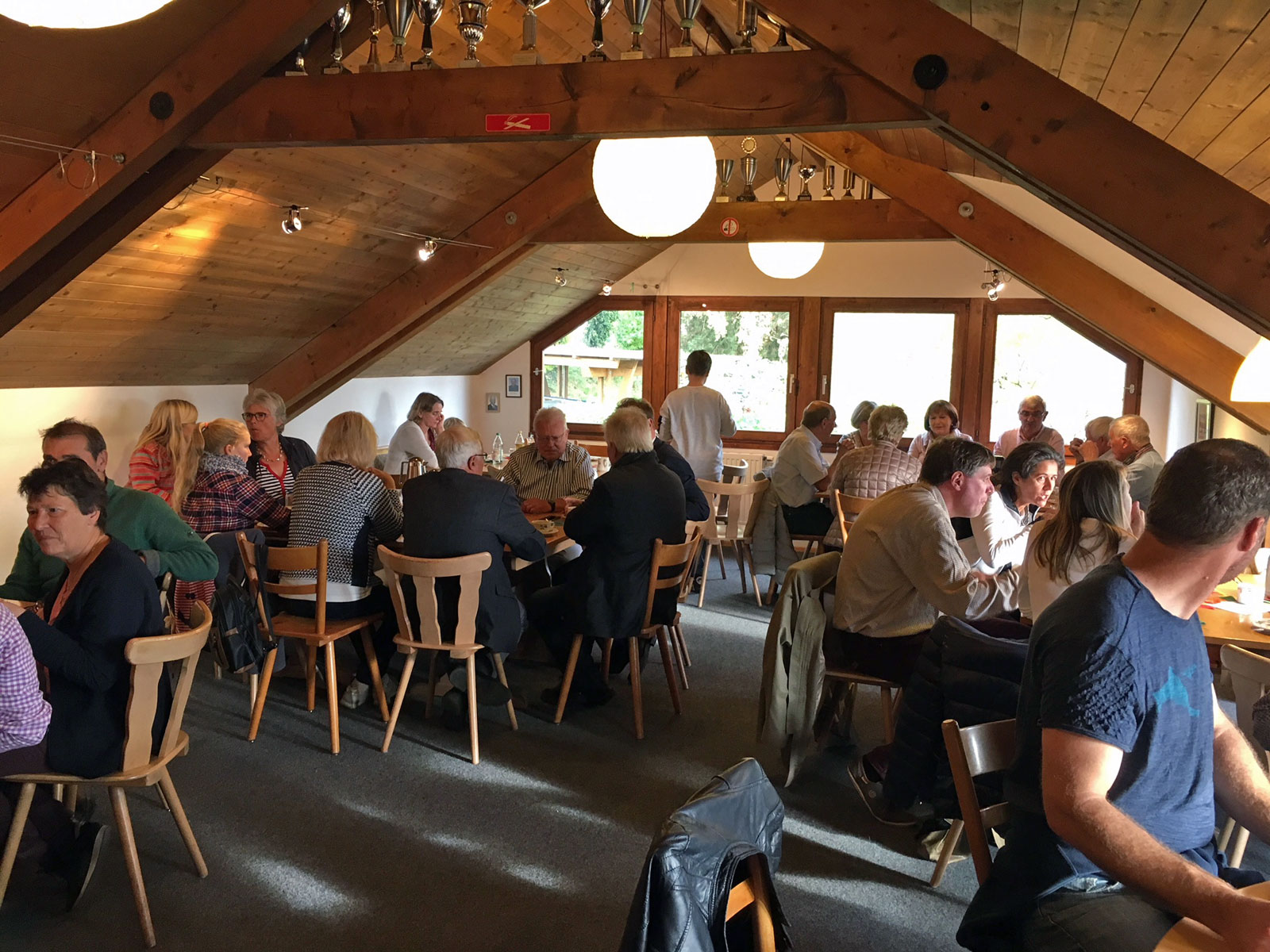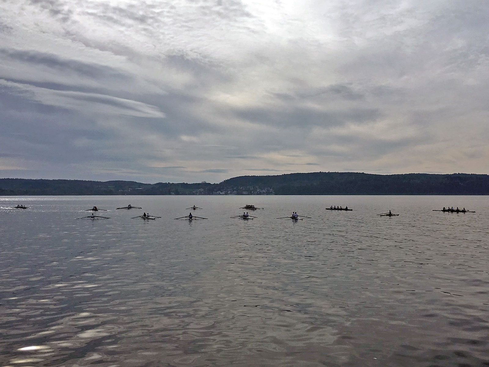 Danach trafen sich alle im Clubraum, wo bereits Kaffee und ein großes Kuchenbüffet sowie eine Gruppe Helfer auf die Gäste wartete. Die Stärkung kam sehr willkommen, denn vor der Taufe waren 56 ÜRC-Mitglieder Richtung Stadt gerudert und hatten sich mit ihren Booten vor dem Landungsplatz aufgebaut. Pünktlich um 14.30 Uhr verkündet dort Vorstandsmitglied Dieter Beising mit dem Megaphon offiziell das Ende der Rudersaison 2017.