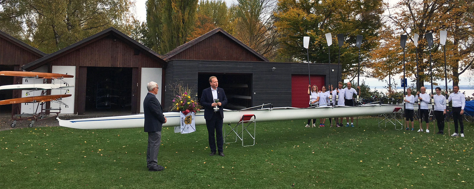 Auf den schönen Namen „Überlingen“ taufte Jan Zeitler am Samstag, den 21. Oktober 2017, den neuen Rennachter des Überlinger Ruderclubs (ÜRC). Dem Oberbürgermeister gefiel neben dem Namen auch die Vorgeschichte des schlanken Boots ausnehmend gut: „Es freut mich ganz besonders, dass ein Boot mit solch einem Hintergrund jetzt in Überlingen zu Hause ist!“ Der ÜRC konnte den Achter gebraucht erwerben, nachdem er eine Saison lang von einer Nationalmannschaft bei europäischen Wettkämpfen gerudert wurde.